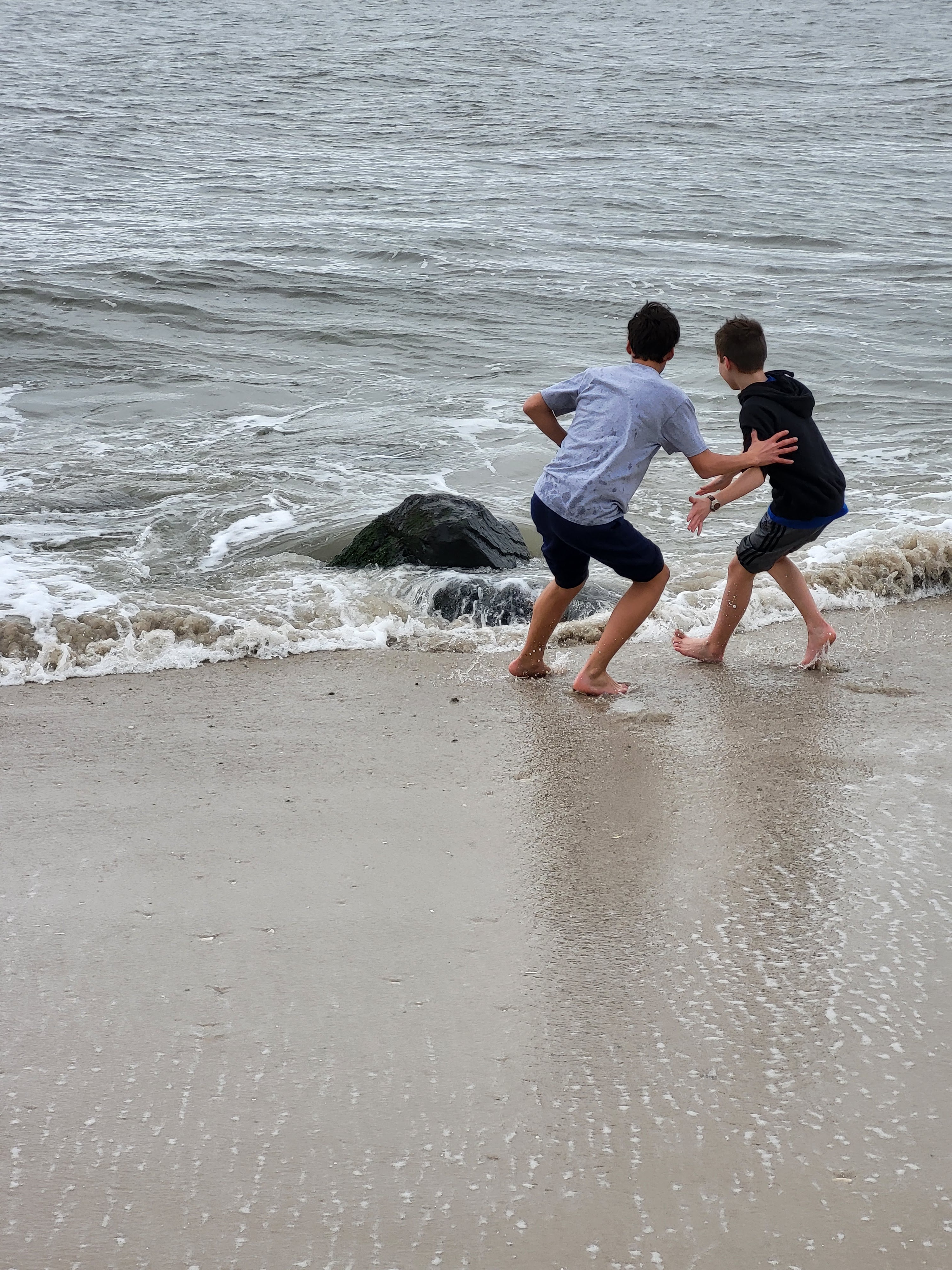 The next day wasn't as rainy as we expected, thank goodness, but that didn't mean we didn't get wet! Well, Jason and I didn't, but after we arrived at Cape May, at the very southern tip of New Jersey, the kids didn't care that it was 50 degrees. They played tag with the waves and lost. Austin took the biggest loss when he jumped off a rock to avoid a big wave and it was deeper than he thought on that side. Since he wasn't hurt or in danger of being washed away, I was laughing way too hard! The look of shock on his face was hilarious! We got him warmed up and enjoyed the little museum and the lighthouse. We went to a WWII lookout that was closed, but spent about 30 more minutes on the beach looking for Cape May diamonds. They're just quartz washed into the ocean by rivers, getting tumbled along the way to shine them up. People actually make jewelry with them. After the visit to the museum, when we saw them on the beach we had to collect some.
